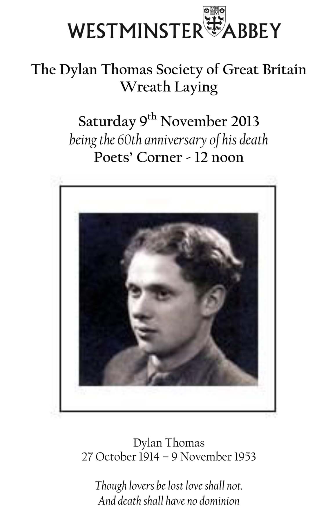 Exactly sixty years to the day that Dylan Thomas died in New York, members of the poet’s family joined members of the Dylan Thomas Society to lay a wreath at Thomas’s memorial stone in Poet’s Corner, Westminster Abbey.