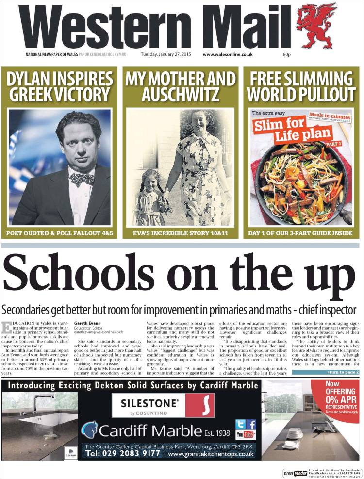 The day after the Syriza party had emerged as the leading party in the Greek election, one of it’s leaders Yanis Varoufakis paraphrased Dylan’s words when he was interviewed on Radio 4’s Today Programme. He said that “Greek democracy chose, to quote your very own Dylan Thomas, to stop going gently into the night and to rage against the dying of the light”. The mention led to ‘Dylan Thomas’ trending on Twitter in the UK. The story also featured on the front page of the Western Mail.