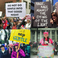 Dylan’s best known poem continues to exert it’s influence on popular culture. As well as featuring as a rallying cry in January’s Women’s March (see above) the poem has also been used in promotional material by US pharmaceutical lobbying organisation PhRMA. The poem had high-profile supporters in popular culture too; Dwayne Johnson ‘The Rock‘ shared Dylan’s words to millions of followers on his social media platforms, as did Florence Welch of Florence and the Machine. Take That used a recording of the poem as an introduction to their song ‘Relight My Fire’ on their recent arena tour, and popular cultural blog Brain Pickings published an article about the poem.