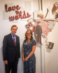 The Dylan Thomas Centre has been shortlisted for a Kids in Museums Family Friendly Museum Award; the winner will be announced in October.A new temporary exhibition ‘I might want to smile‘ has opened at the Centre, and runs until December 22nd. The exhibition looks at Dylan’s sense of humour, and includes loan material from the National Library of Wales alongside items from their own collection. A spoof of Under Milk Wood written by Keith Waterhouse and Willis Hall for the BBC’s ‘That Was the Week That Was’ is on show for the first time. The Centre had a high-profile visitor in May when Lewis Lukens, Acting Ambassador at the US Embassy in London, visited the ‘Love the Words’ exhibition.