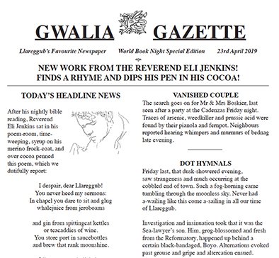 World Book Night on April 23rd included a project to create the Gwalia Gazette, an Under Milk Wood inspired imagined periodical, created using favourite quotes from the play for voices suggested by contributors. You can download a PDF and watch a video here. Under Milk Wood was chosen for the tribute by WBN coordinator Linda Parr.
