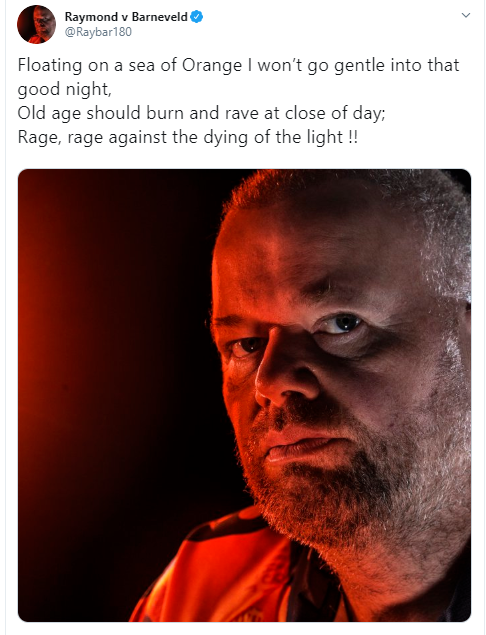 Five times World Darts Champion Raymond van Barneveld quoted Dylan Thomas on his Twitter account when signing off from his darts’ career.
